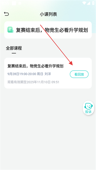 3、进入课程详情页面后,找到对应课程章节,点击看回放按钮。