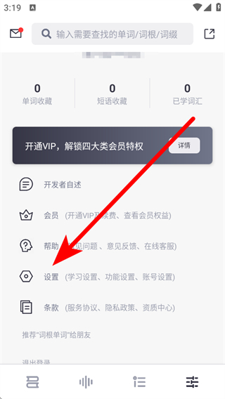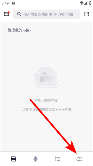 1、在词根单词书架页面,点击底部右侧个人图标,进入个人功能页面。