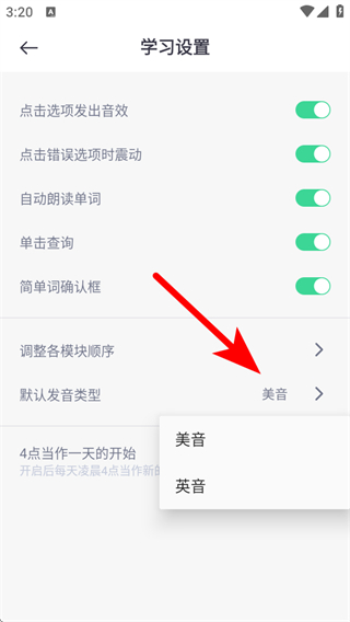 4、在页面点击默认发音类型,选择美音或英音,完成发音类型设置操作。