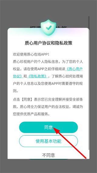 1、在质心用户协议和隐私政策弹窗中,点击同意,进入软件主界面。