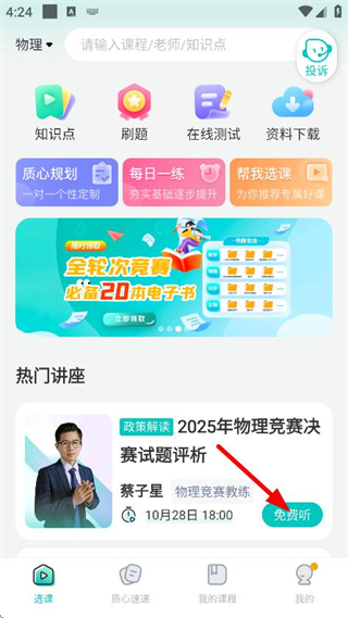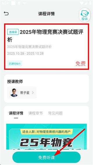 2、在选课页面,找到物理竞赛决赛试题评析讲座,点击免费听。