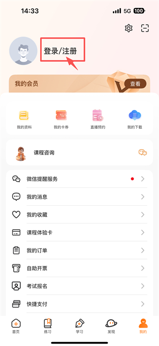 2、在个人中心页面,点击登录/注册区域,进入登录选择界面。