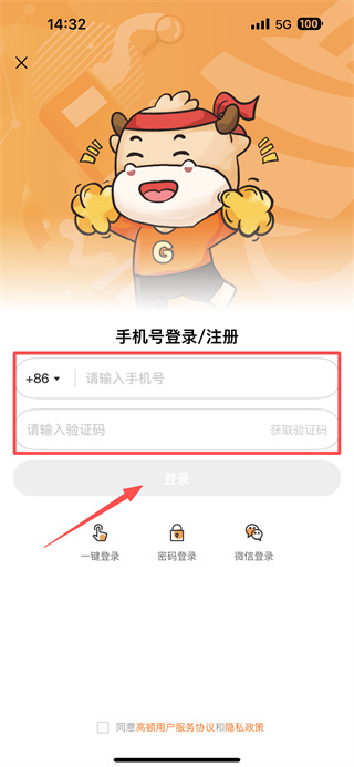 4、在手机号登录页面,输入手机号码,获取并输入验证码后勾选同意高顿用户服务协议和隐私政策,完成账号登录操作。