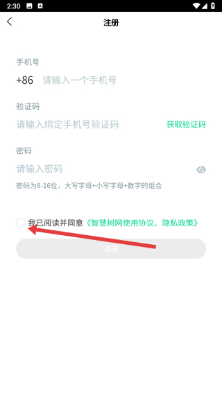 2、在进入到注册页面后,开始注册前先点击勾选我已阅读并同意按钮后操作。