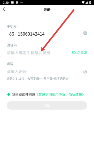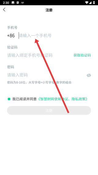 3、在点击完同意按钮后,可以在上方输入框中填写手机号以便获取验证码进行注册。