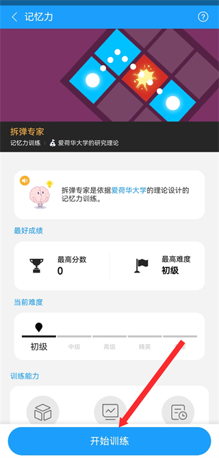 3、在记忆力训练详情页面,点击开始训练,进入拆弹专家训练游戏界面。