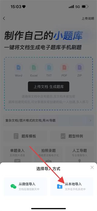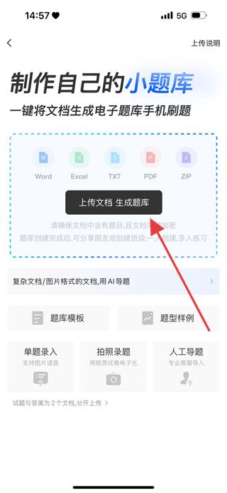 2、在制作小题库页面,点击上传文档生成题库,进入选择导入方式页面。