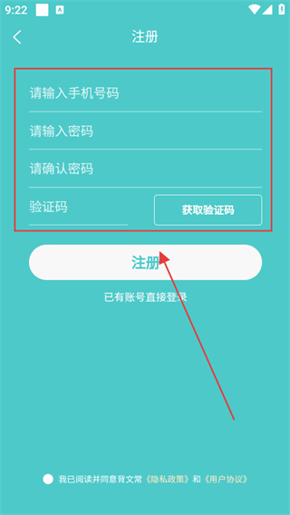 4、输入手机号码、密码、确认密码、验证码,勾选隐私政策和用户协议,点击注册。