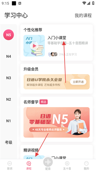 2、点击课程,进入学习中心,有个性化推荐课程,还能看到不同等级的课程以及名师督学课程。