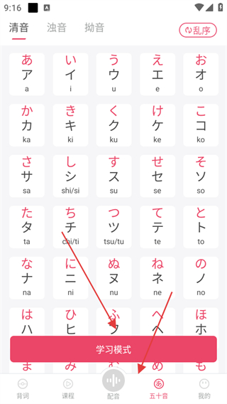 4、点击五十音,进入五十音图学习界面,涵盖清音、浊音、拗音,还设有学习模式,帮助用户掌握日语基础发音。