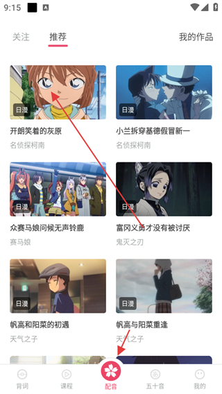 3、点击配音,进入推荐页面,提供众多日漫等视频素材,用户可以进行日语配音练习,提升口语表达和语感。
