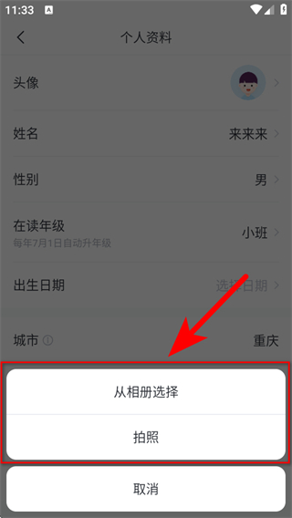 4、在弹出的选项中,选择从相册选择或拍照,完成头像图片更换操作。