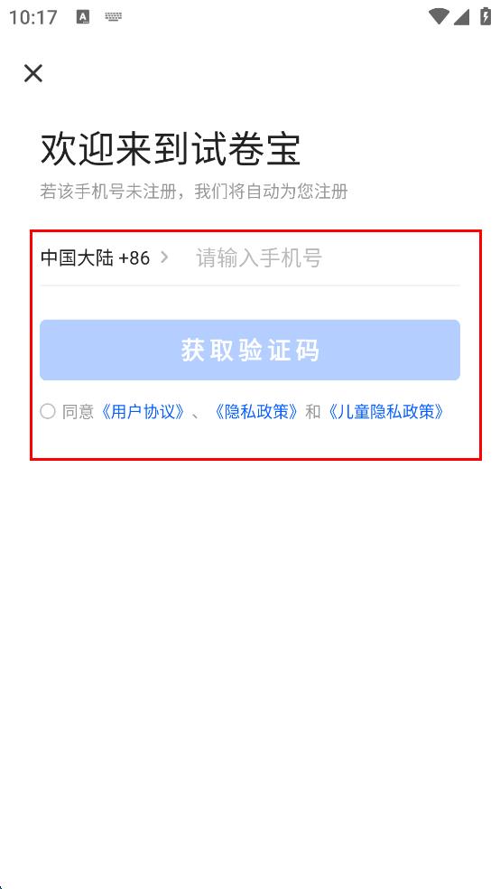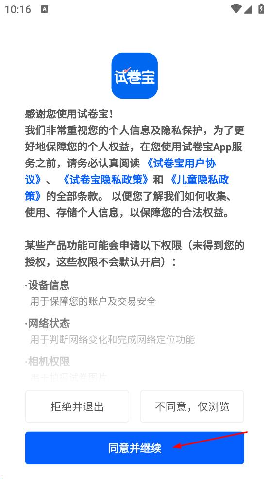 1、打开试卷宝APP,会弹出关于个人信息及隐私保护的提示,点击“同意并继续”按钮。