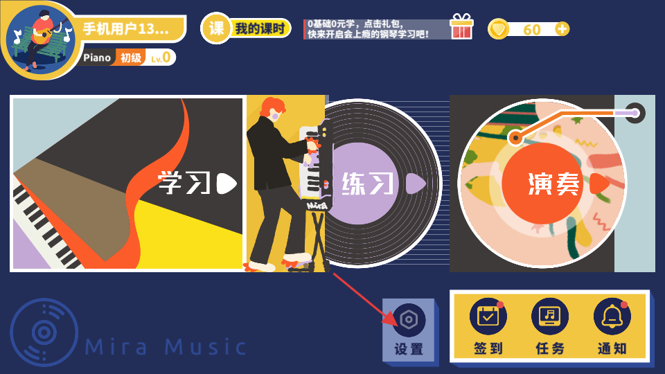 1、打开迷鹿吉他钢琴尤克app,在主界面中点击下方的设置按钮。