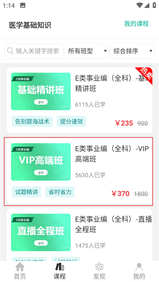 2、在课程页面,点击E类事业编-VIP高端班,进入课程详情页面。
