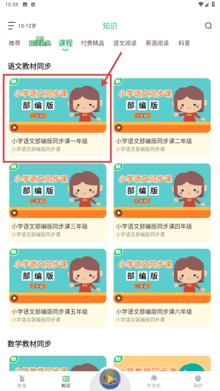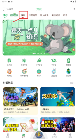 1、打开儿童教育类应用,点击底部知识选项,进入知识板块页面。