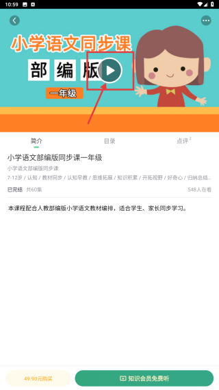 4、在课程详情页,点击播放按钮,开始学习小学语文部编版一年级同步课程。