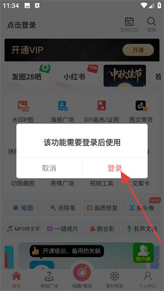 2、点击弹出该功能需要登录后使用,点击登录,进入登录页面。