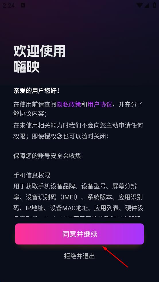 1、打开嗨映,弹出使用提示,点击同意并继续,进入软件首页。