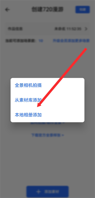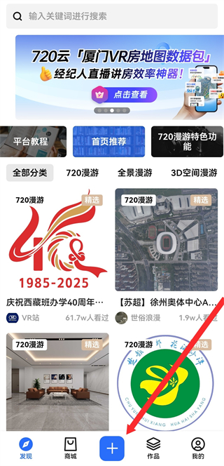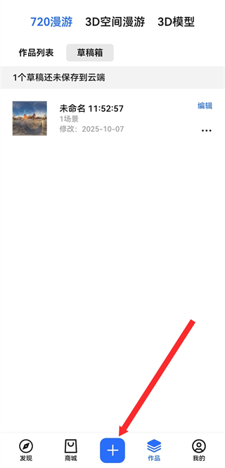 2、在作品管理页面,点击底部+,进入创建720漫游的选项页面。