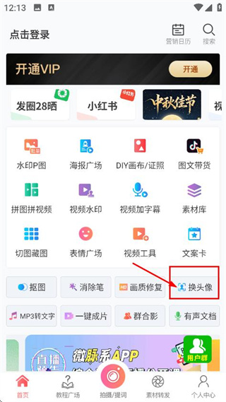 1、在微脉水印相机首页,点击下方的换头像,弹出操作选项菜单。