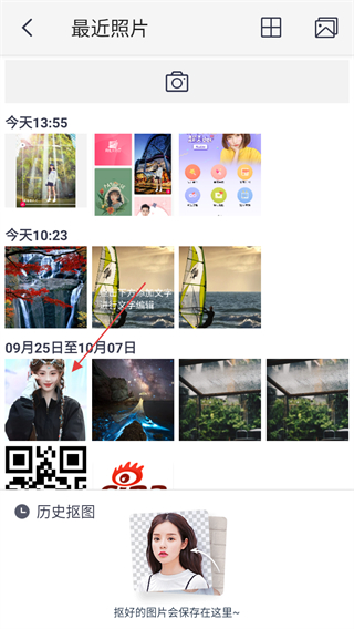4、在最近照片选择页面,选择要抠图的照片,进入抠图编辑页面。