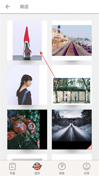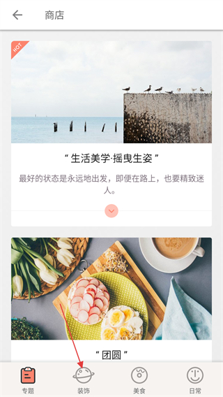2、在商店页面,点击底部的装饰分类,查看装饰相关的素材等内容。