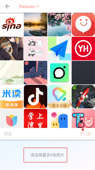2、在图片选择页面,按照提示选择照片后,点击下一步。