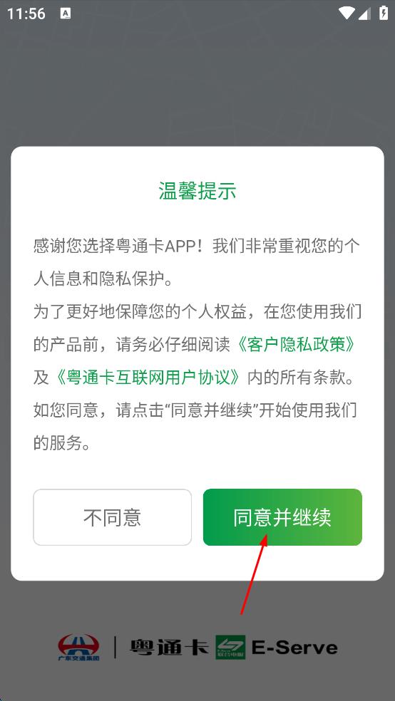 1、打开粤通卡APP,会弹出温馨提示页面,仔细阅读后点击同意并继续按钮。