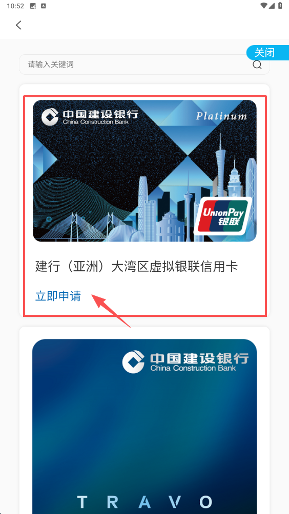 2、在信用卡申请页面,选择建行亚洲大湾区虚拟银联信用卡,点击立即申请按钮。