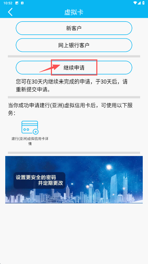 3、进入虚拟卡申请页后,点击继续申请选项。