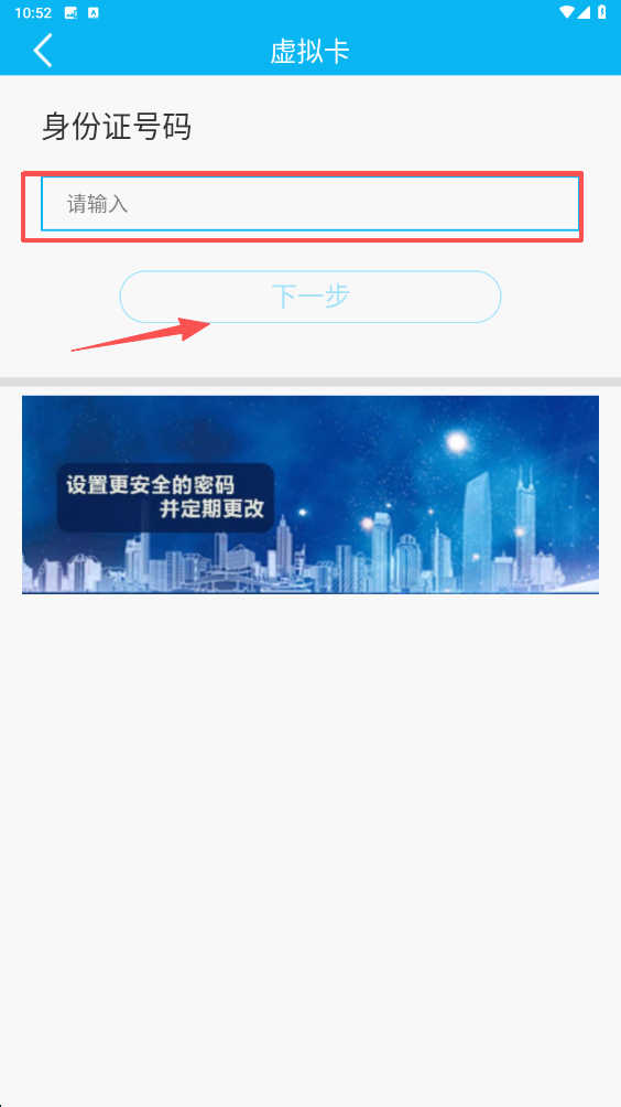 4、在身份证号码输入栏输入身份证号码,点击下一步按钮,继续完成信用卡申请流程。