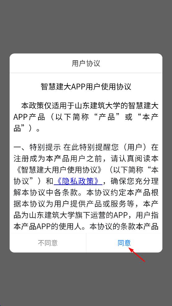 1、打开智慧建大APP,在弹出的用户协议提示框中,点击同意。