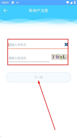 2、在新用户注册页面,输入手机号和验证码,点击下一步。