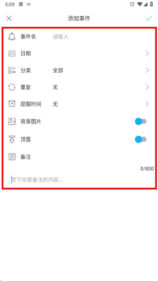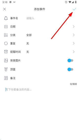 2、在添加事件页面,依次输入事件名,选择日期、分类,设置重复周期和提醒时间,还能按需开启背景图片、顶置开关,以及填写备注信息。