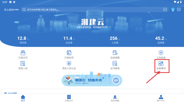 1、打开湘建云应用,点击全部事项选项,进入事项列表页面。