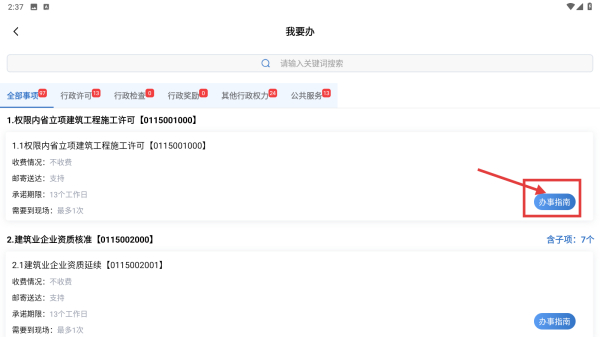 2、在事项列表中,选择需办理的事项,点击办事指南按钮,进入办事指南页面。
