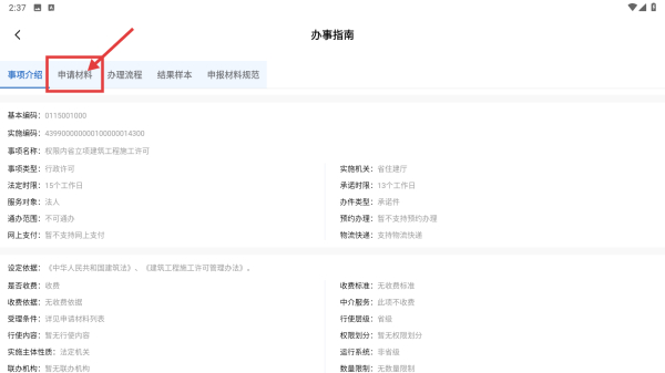 3、在办事指南页面,点击申请材料选项卡,查看所需申请材料。
