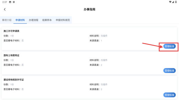 4、对于具体材料,点击受理标准按钮,查看材料的受理要求。