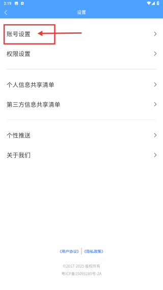 3、在设置页面,点击账号设置选项,进入账号管理界面。