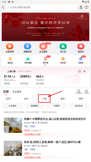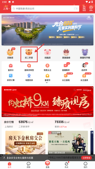 1、打开房产类应用,点击买二手房入口,进入二手房房源列表页面。