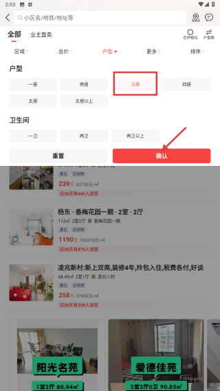3、选择三居户型,点击确认按钮,应用筛选条件。
