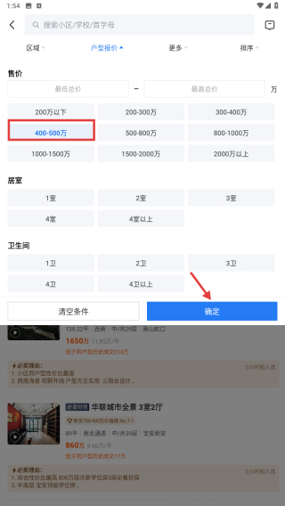 3、选择400-500万总价区间,点击确定按钮,应用筛选条件。