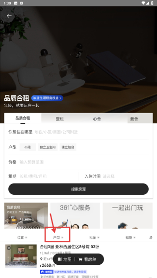 1、打开租房类应用,点击品质合租入口,进入合租房源筛选页面。