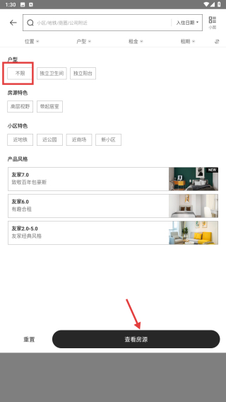 2、在筛选页面,点击户型分类,选择不限户型选项。