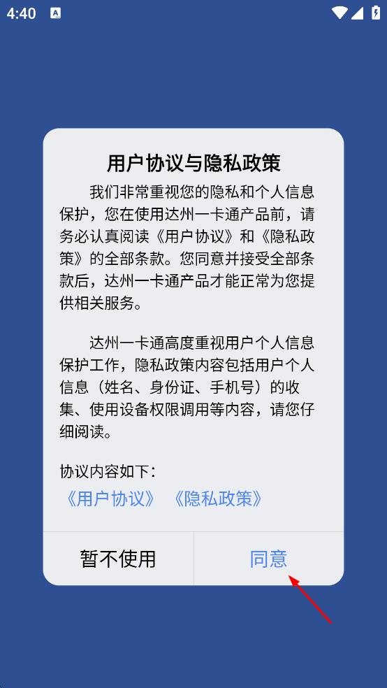 1、打开达州一卡通,弹出用户协议与隐私政策,点击同意,进入软件首页。