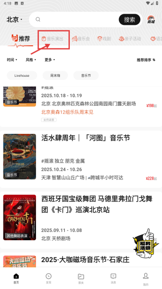 1、打开演出票务类应用,点击音乐演出分类,进入音乐演出列表页面。