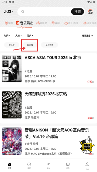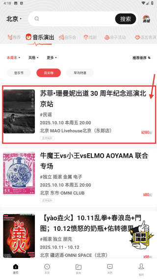 2、在音乐演出页面,选择周末场标签,筛选出周末的音乐演出。