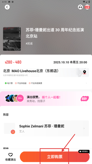 3、精准演出搜索购票:支持按音乐人、演出类型、城市等维度搜索目标演出,找到后可直接在线完成购票,流程简洁,为用户节省时间成本。