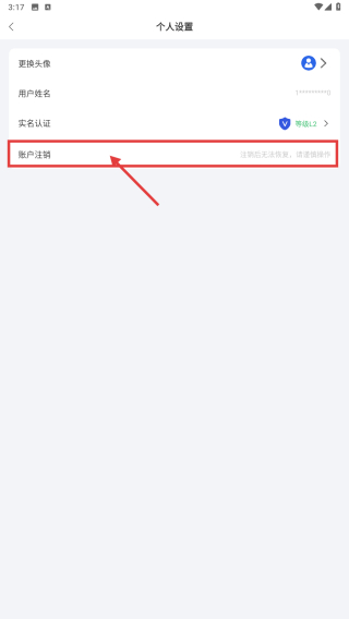 3、在个人设置页面,点击账户注销选项,进入账户注销流程。